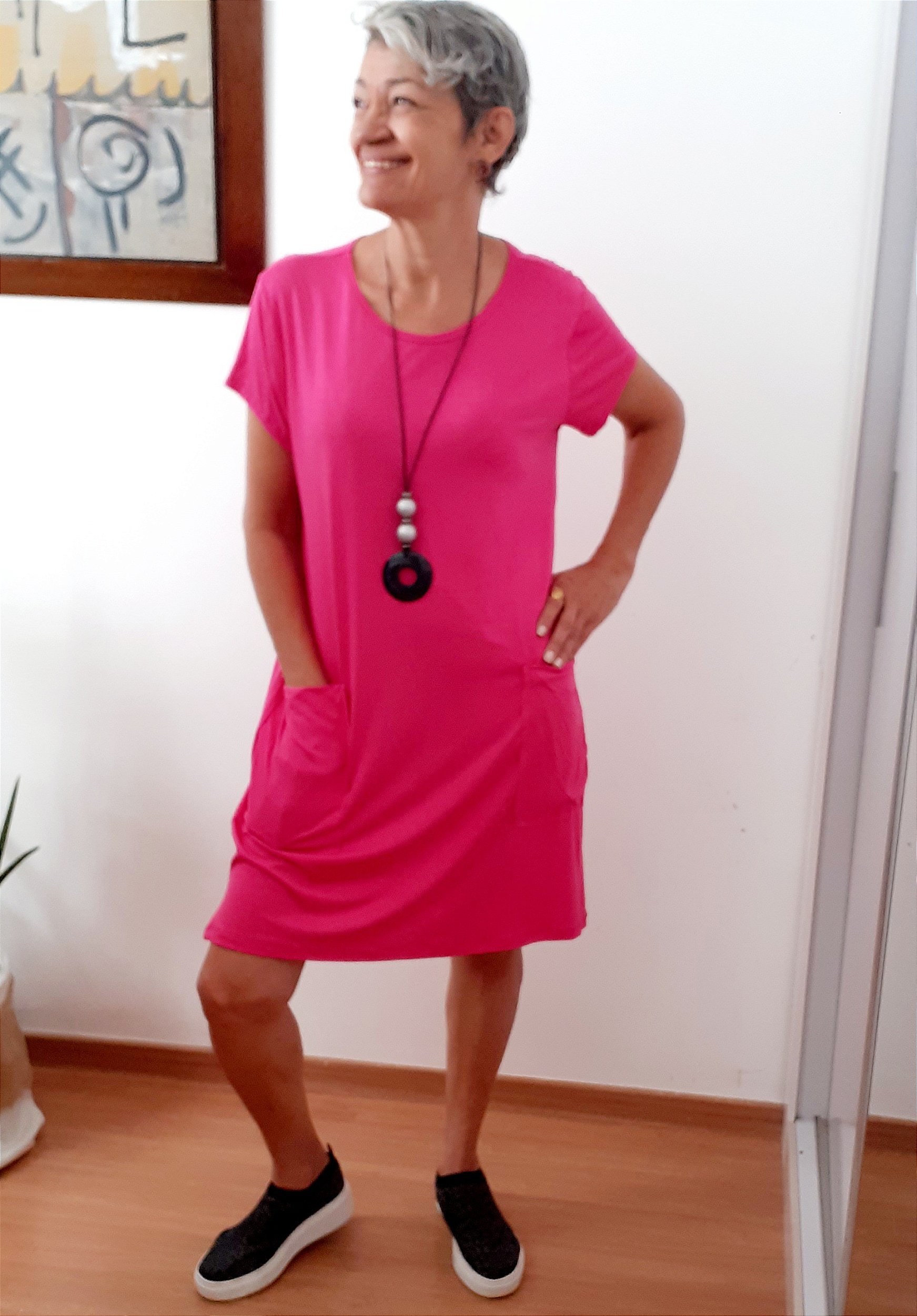 Peça atemporal,veste até o manequin 46(verifique nossa tabela de medidas,bolsos internos nas laterais .decote redondo,mangas curtas ,tecido moletin ,muito confortavel sem elasticidade ,comprimento curto abaixo do joelho ,a modelo mede 1.65 de altura.